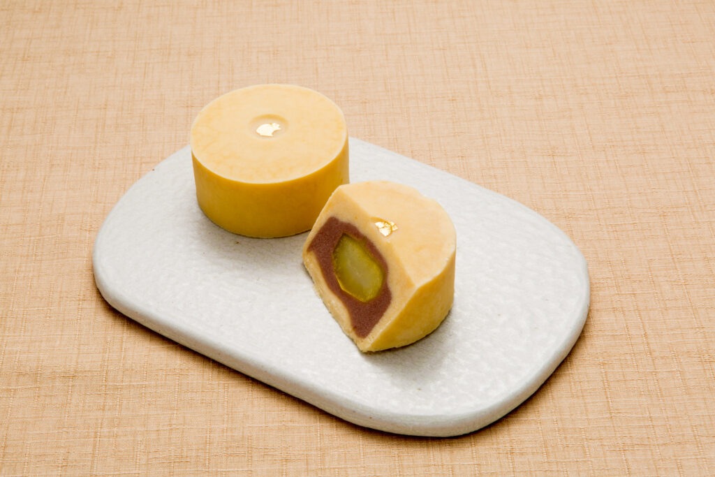 手芒豆、卵黄や栗の実など新鮮な素材に、心を込めて作り上げた風味豊かな生地を金箔に見立て、真ん中には特別大粒の柔らかな栗を十勝小豆で包み、ぎゅっと覆いくるみました。