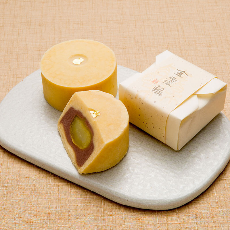 手芒豆、卵黄や栗の実など新鮮な素材に、心を込めて作り上げた風味豊かな生地を金箔に見立て、真ん中には特別大粒の柔らかな栗を十勝小豆で包み、ぎゅっと覆いくるみました。